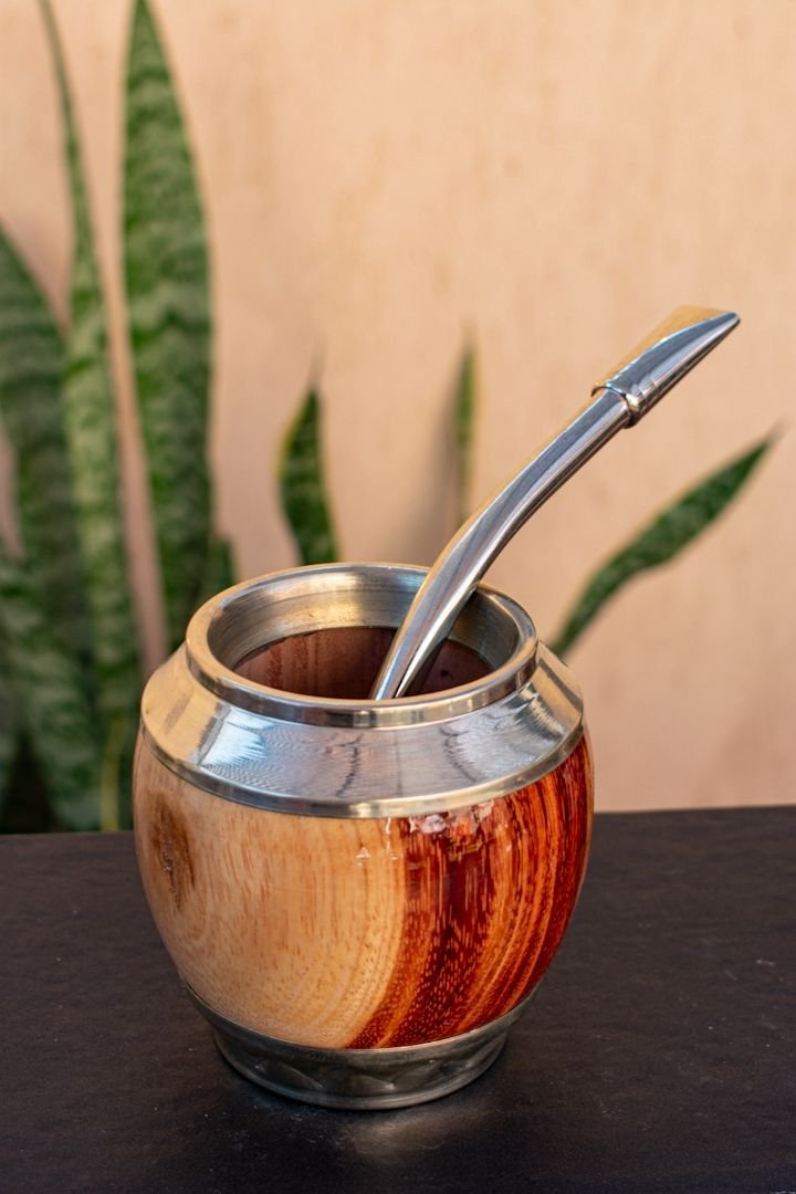 - Virola: Cuenta con una virola de alpaca, un material que no se oxida y protege la boca del mate, dándole un toque elegante y distintivo, a menudo con diseños lisos o cincelados.